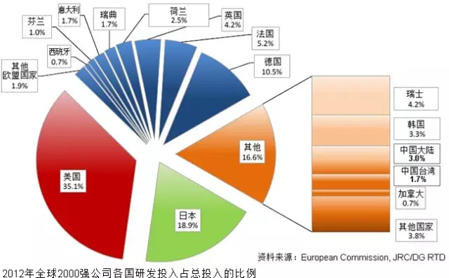 这2000家公司研发总投入5388亿欧元,其中美国占35.1%,日本占18.9%,德国占10.5%,法国占5.2%,英国占4.2%,瑞士占4.2%,韩国占3.3%,荷兰占2.5%,瑞典占1.7%,意大利占1.7%,芬兰占1%,作为世界人口最多和GDP世界老二的中国大陆仅占3%。